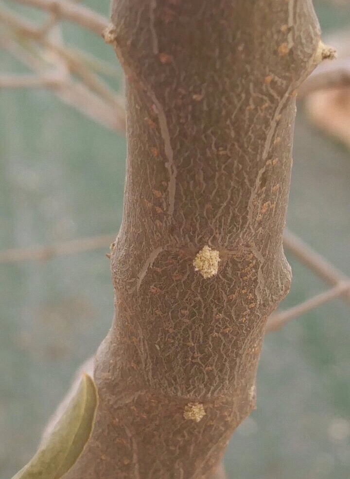 על הגזע יש שכבה חומה לבנה שנראית דומה למלח. על חלק מהעלים בחלקם האחרוי יש שכבה לבנה מתפוררת. בנוסף, יש נמלים שהקימו מושבה.