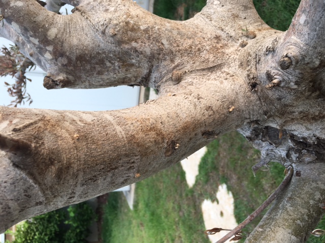 לאחרונה כל הצמרת שלו התייבשה, כל העלים מתייבשים ונושרים. כרגע חצי מהעץ יבש וגם עץ התאנה שלידו החלה מתייבשת והעלים מקופלים.